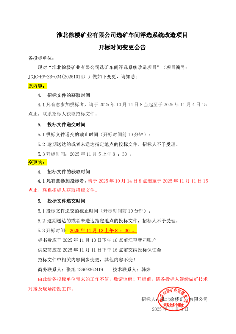 淮北徐楼矿业有限公司选矿车间浮选系统改造项目开标时间变更公告