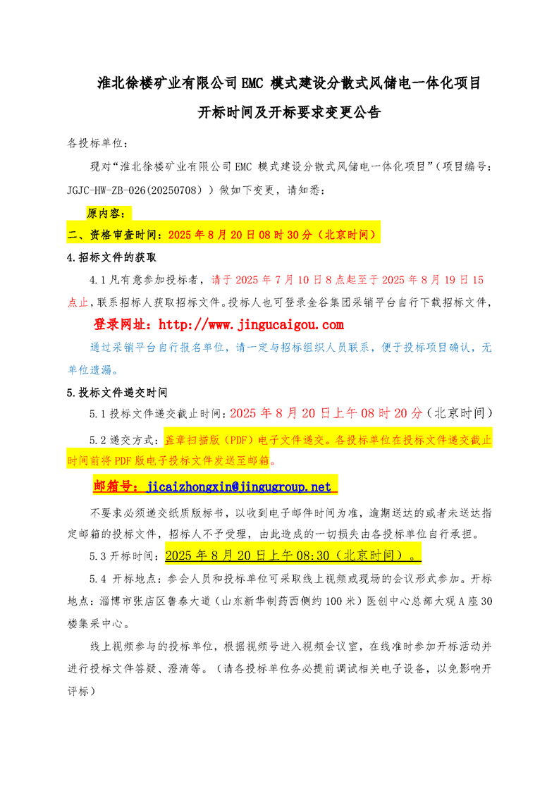 淮北徐楼矿业有限公司 EMC 模式建设分散式风储电一体化项目开标时间及开标要求变更公告